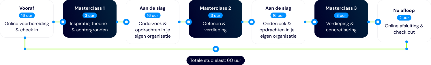 A: In totaal staat er 60 uur aan taakbelasting voor deze masterclass.